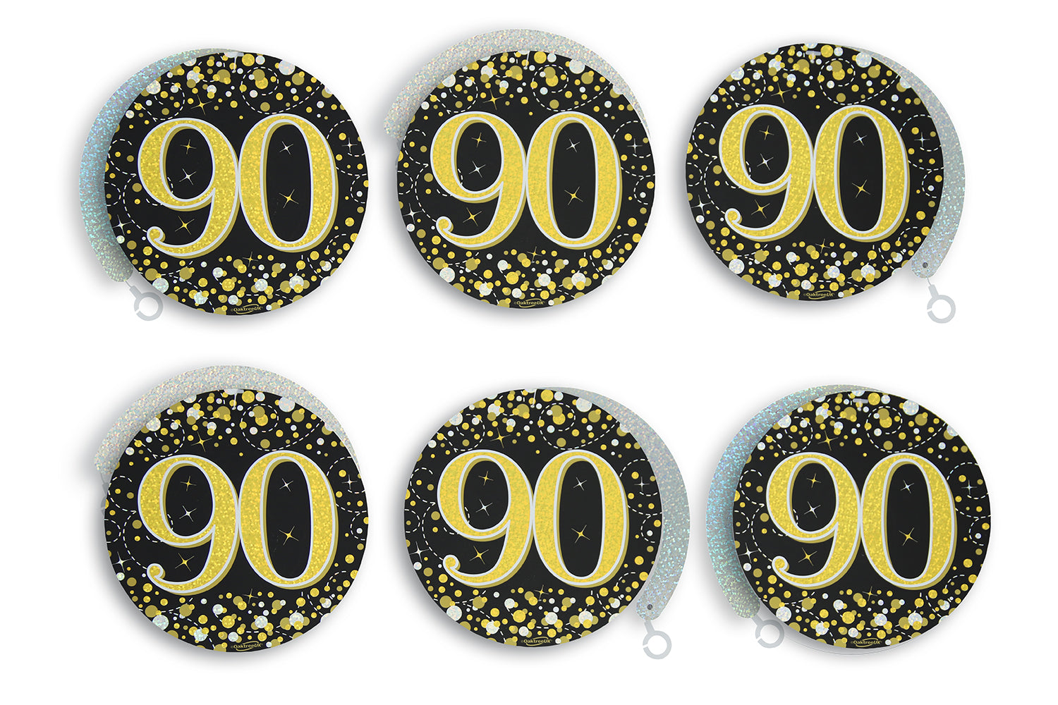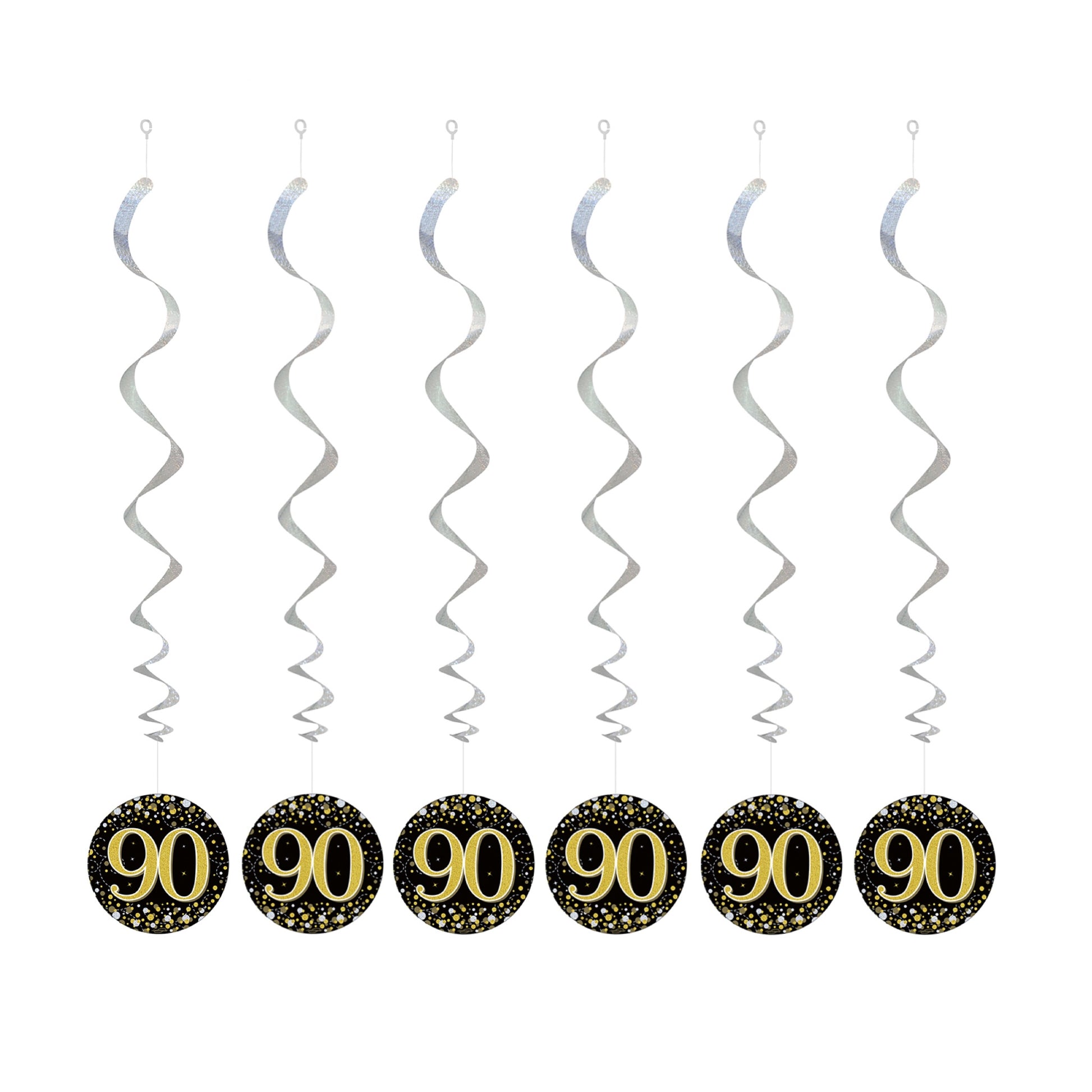 These black, gold and silver hanging swirls will add some glitz to your special birthday celebrations. A plastic hook is attached to each swirl for easy hanging.